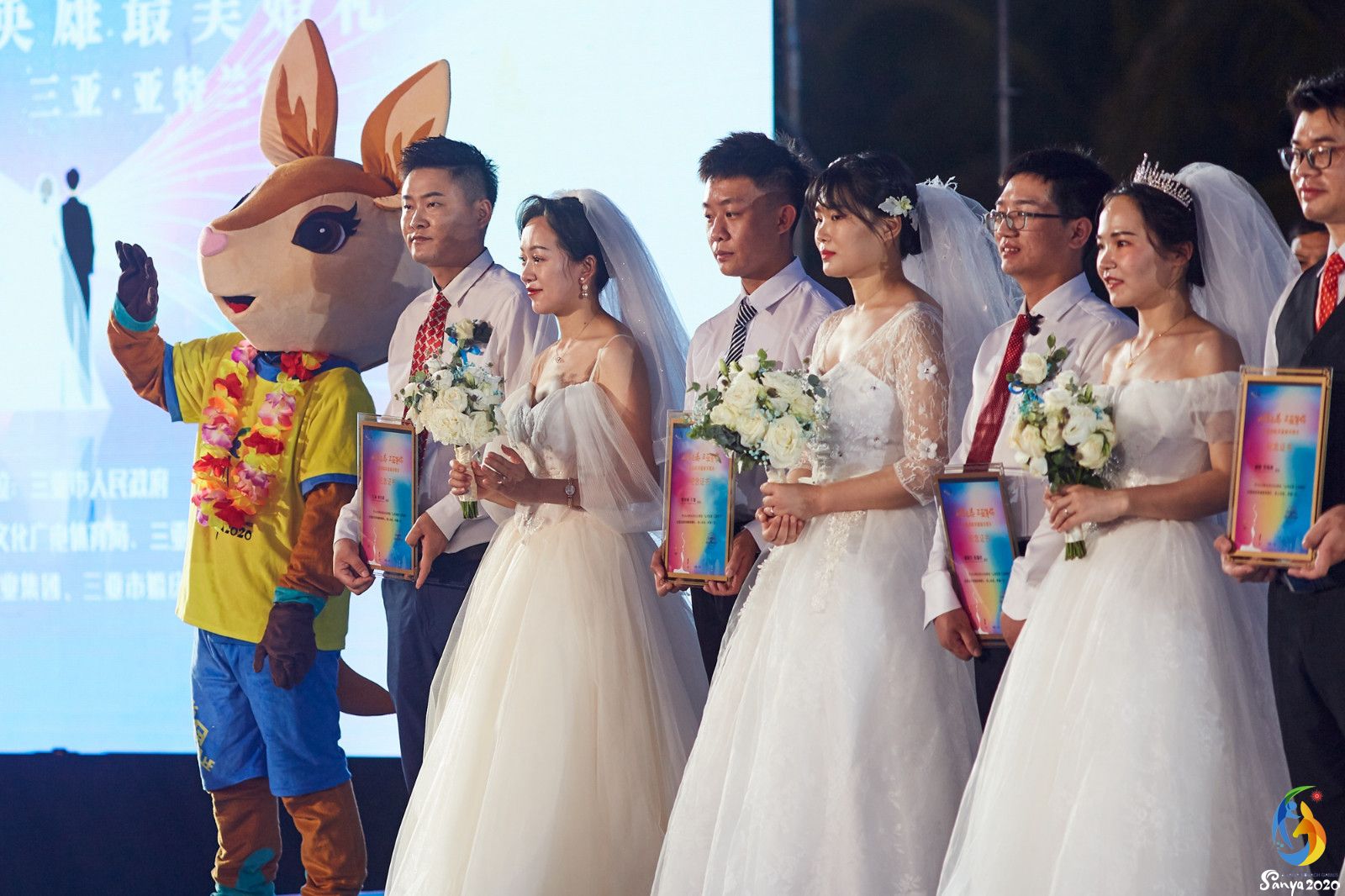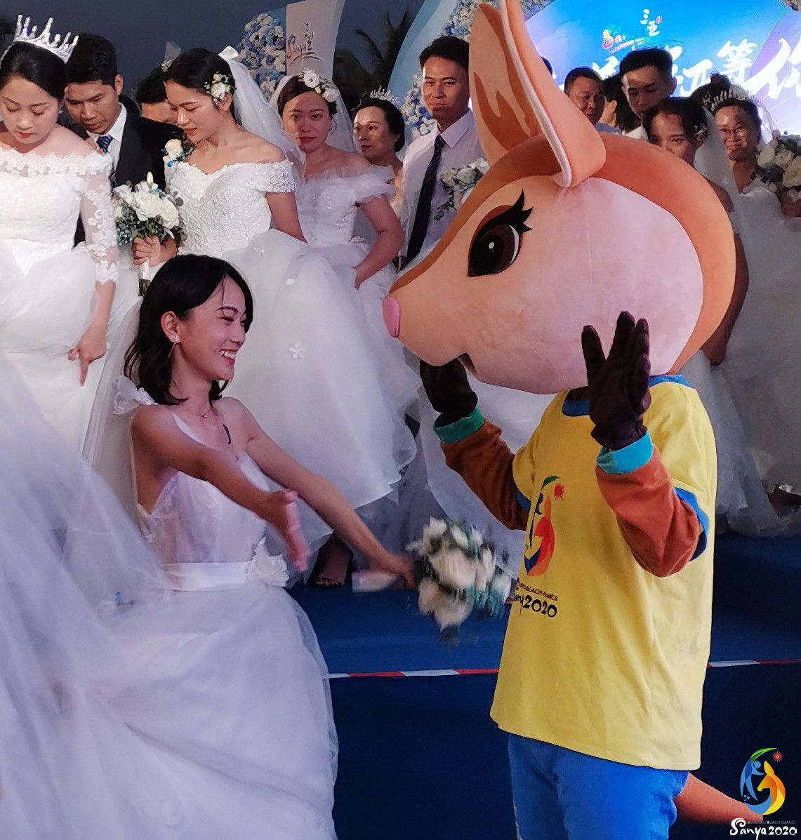 6月6日,“山河无恙三亚等你”全国战疫英雄最美婚礼在三亚亚特兰蒂斯举行,来自全国15个省份的百对战疫英雄新人携手许下爱的诺言。活动当天,2020年第六届亚洲沙滩运动会(以下简称“亚沙会”)吉祥物“亚亚”成为“证婚使者”,见证百对新人执手天涯盟誓。