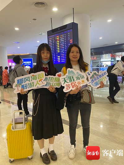 旅客购买“随心飞”产品,搭乘飞机来琼并合影。记者苏靓摄