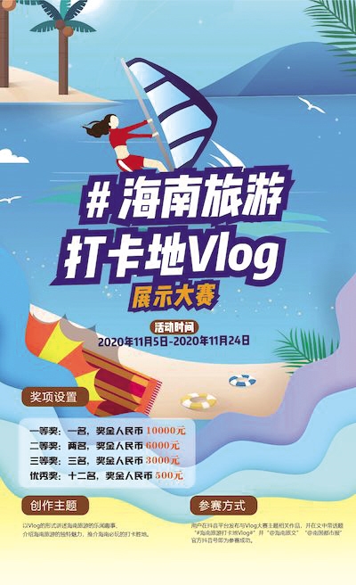 11月5日—11月24日,由海南省旅文厅主办的海南旅游“打卡地”vlog展示大赛正式启动,现面向全国网友征集积极向上、充满活力的海南旅游短视频作品。