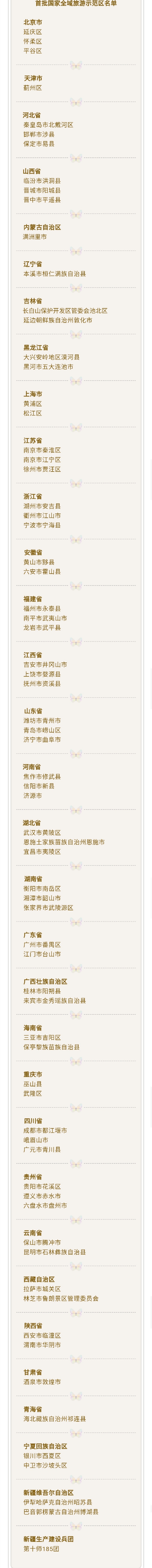 为贯彻落实《中共中央 国务院关于完善促进消费体制机制 进一步激发居民消费潜力的若干意见》《国务院关于印发“十三五”旅游业发展规划的通知》《国务院办公厅关于促进全域旅游发展的指导意见》关于开展全域旅游示范区创建工作的有关要求,文化和旅游部依据《国家全域旅游示范区验收、认定和管理实施办法(试行)》《国家全域旅游示范区验收标准(试行)》,开展了第二批国家全域旅游示范区验收认定工作,确定了第二批国家全域旅游示范区名单,现予以公示。