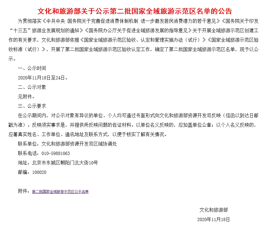 文化和旅游部关于公示第二批国家全域旅游示范区名单的公告