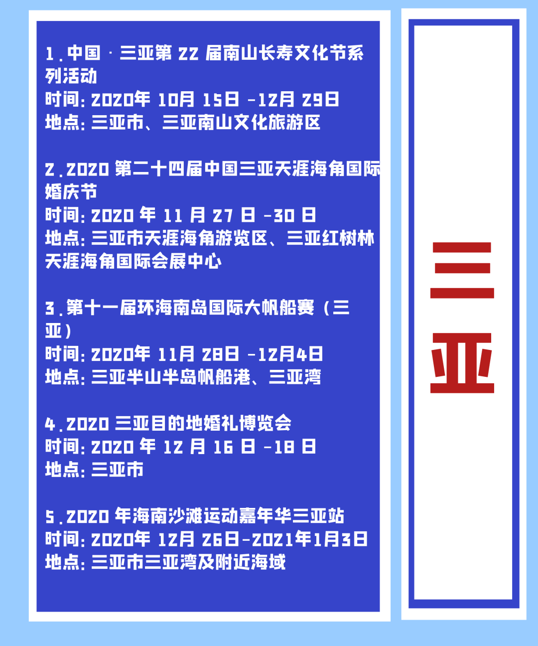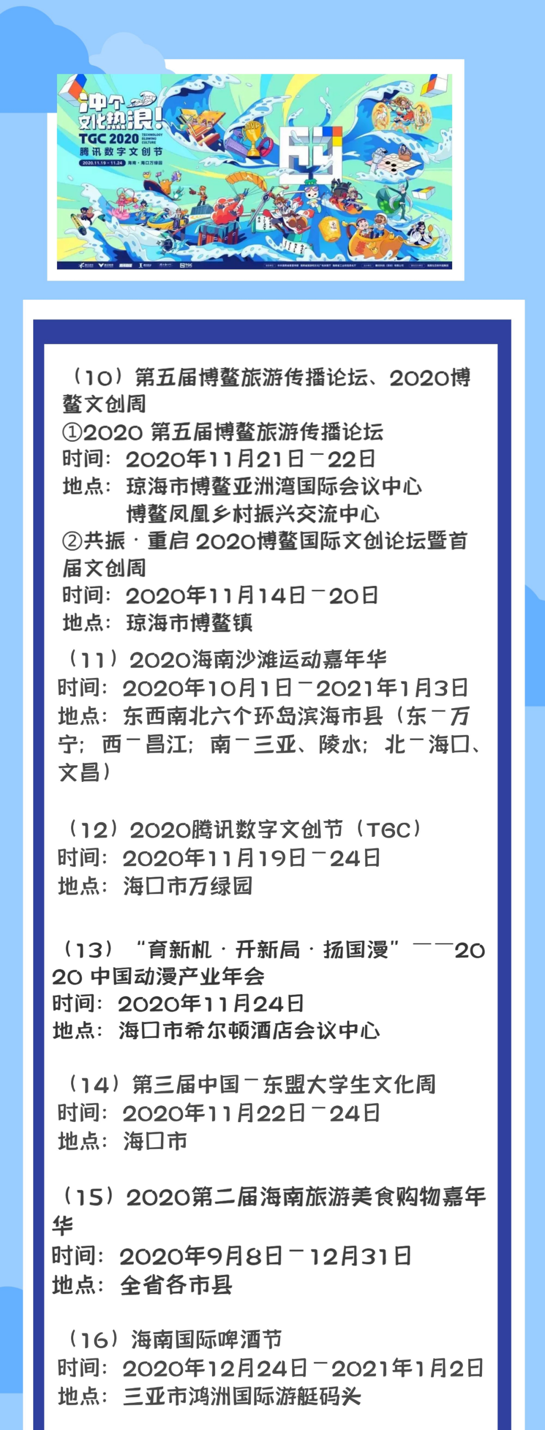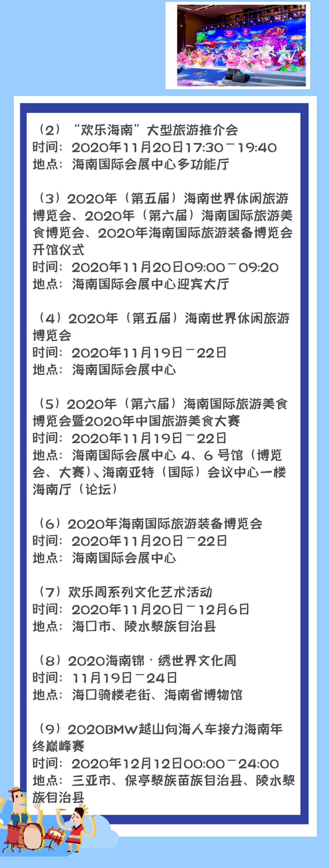 20日上午9点和晚上8点,新海南客户端、南海网、南国都市报将开启两场直播,早上带你逛2020年(第五届)海南世界休闲旅游博览会、2020年(第六届)海南国际旅游美食博览会、2020年海南国际旅游装备博览会三大展会,晚上带你见证2020年海南国际旅游岛欢乐节正式开幕。