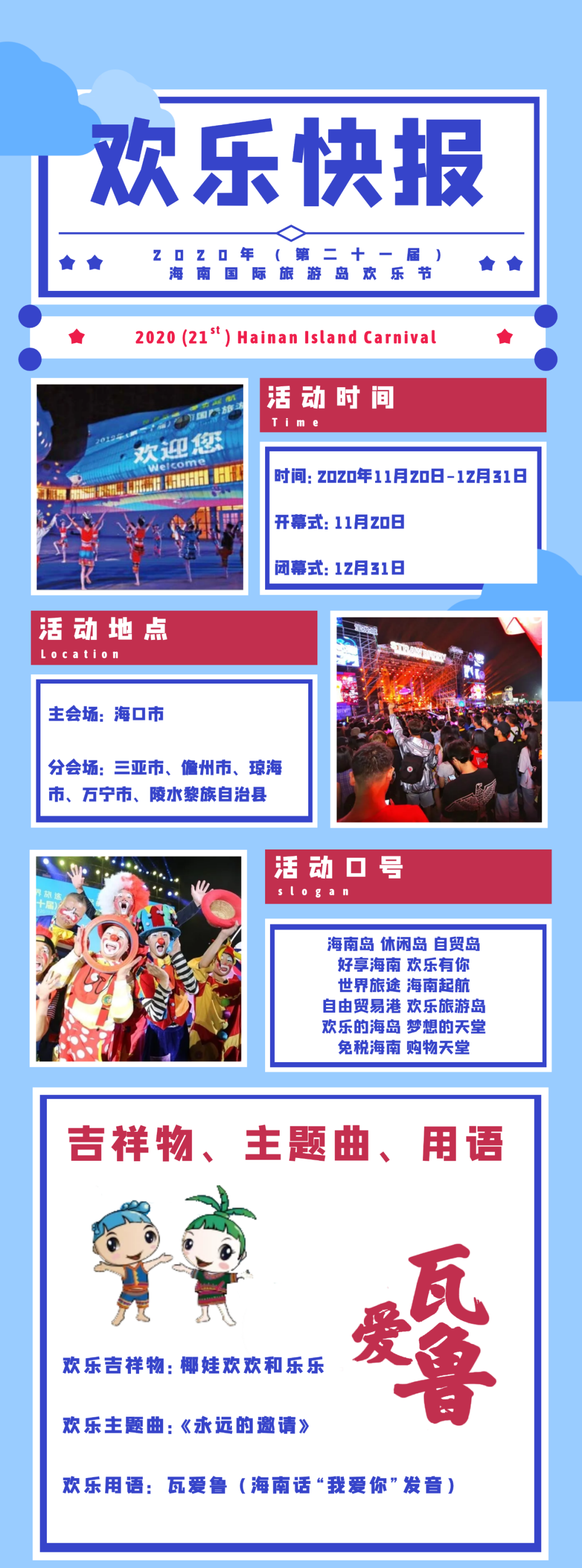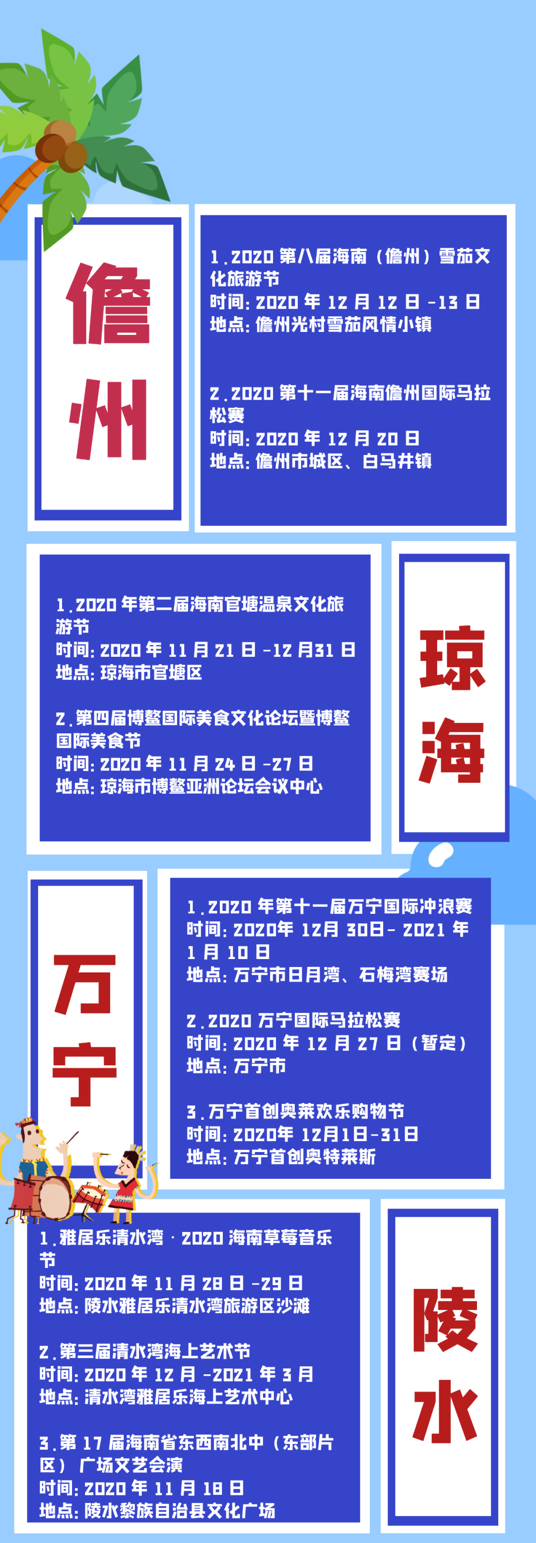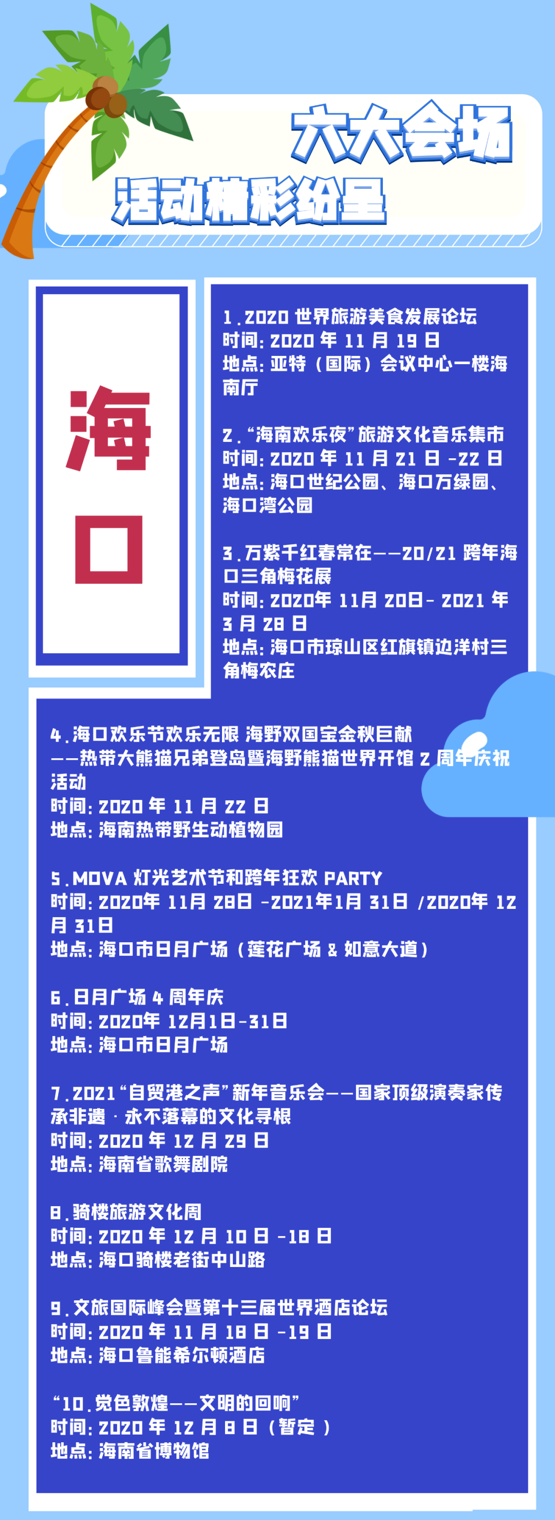 新海南客户端、南海网、南国都市报11月19日消息(记者钟圆圆)一年一度的海南国际旅游岛欢乐节来咯!11月20日,2020年海南国际旅游岛欢乐节将正式启幕。整个活动将持续至12月31日,来海南,带你畅玩一个月。