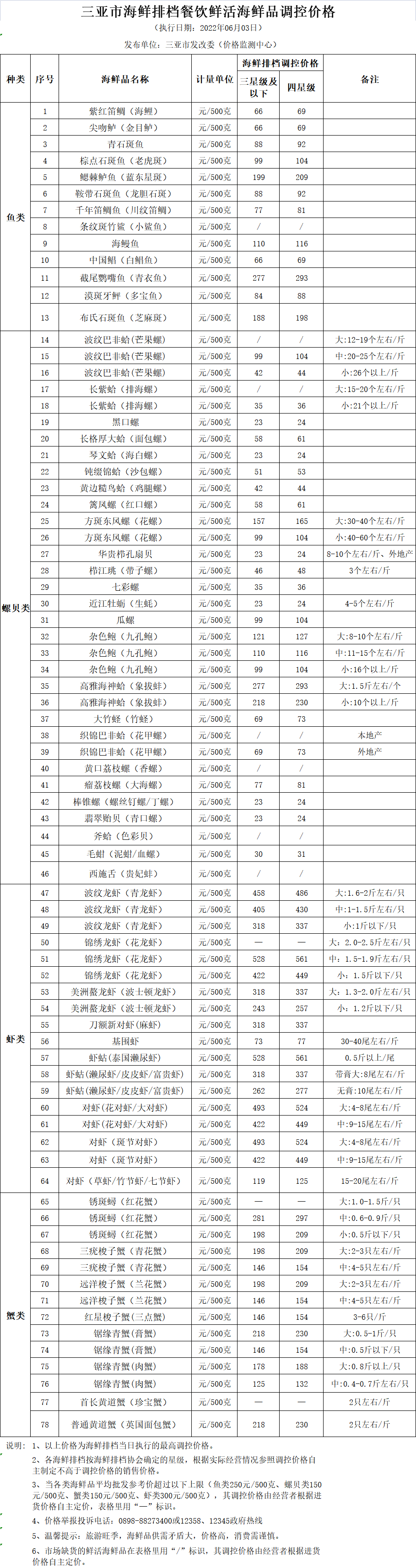 三亚市海鲜排档餐饮鲜活海鲜品调控价格(2022.06.03)