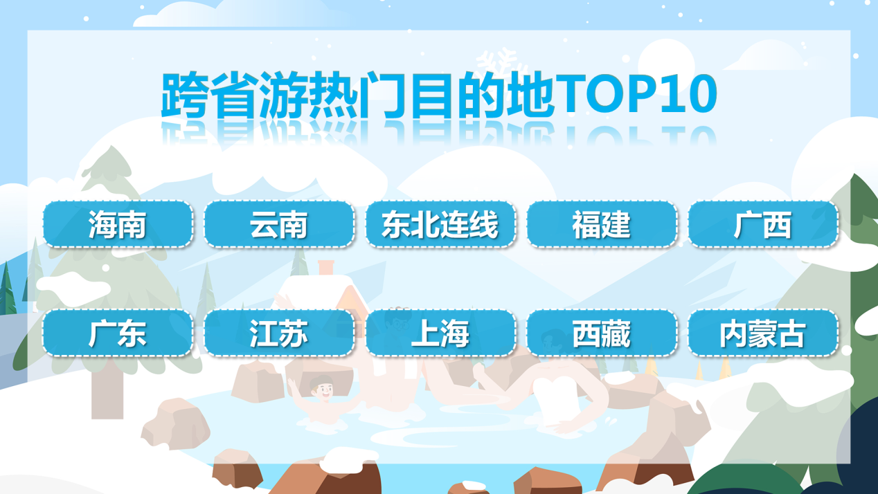 跨省游方面,元旦假期跨省游订单占比为36%,海南、云南、东北连线、福建、广西、广东、江苏、上海、西藏、内蒙古等目的地订单量持续走高,其中,海南、云南两地吸引了近七成跨省游用户前往。