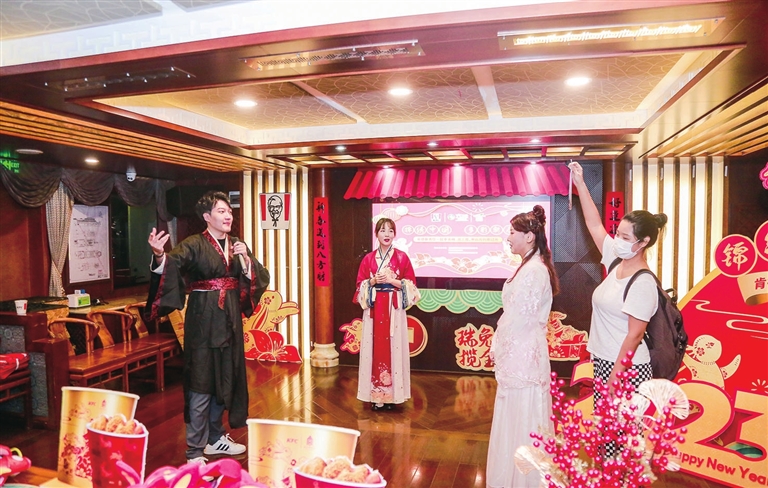“快来看,这里有个年货铺子,看起来好可爱好有趣呀!”刚步入一层大厅,游客们就被眼前布置古香古色的“肯德基年货铺子”吸引了注意力,纷纷上前询问拍照打卡。