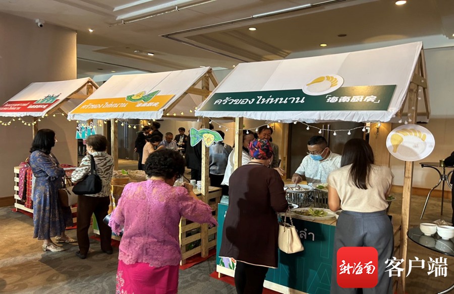 为让参会嘉宾更好地体验海南旅游特色,海南省旅文厅诚意满满做足功课,在推介活动现场打造了沉浸式海南场景,清补凉、海南鸡饭等美食摊位吸引着嘉宾排队品尝,竹竿舞、学说海南话等互动氛围十足。当一首首耳熟能详的琼泰歌曲响起,一个个惊喜大奖的赠出,把全场气氛推向高潮。