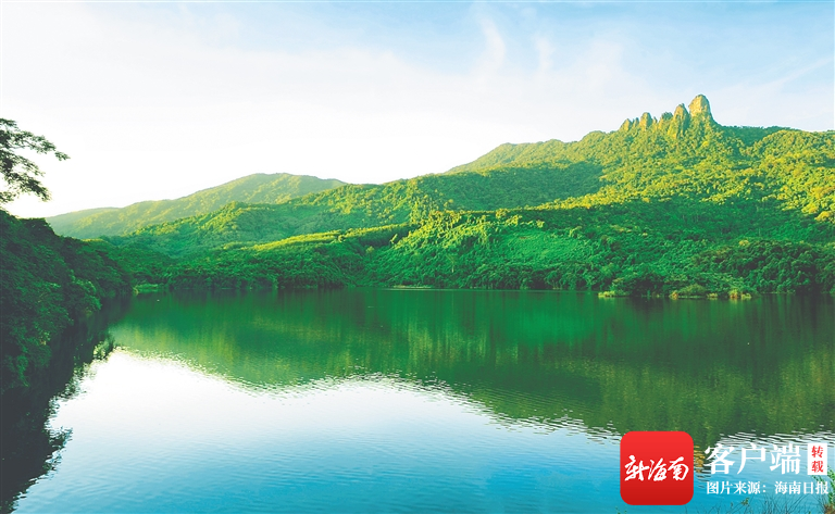 这是一张保亭七仙岭的照片。碧玉般的湖水中倒映着翠绿的山,阳光下,山水泛出淡淡金光,十分美丽。