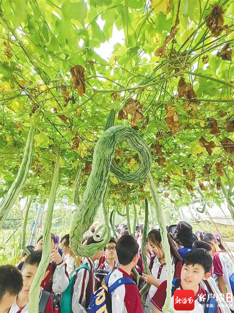 海南航天工程育种研发中心的蛇瓜吸引了不少青少年的关注。海南日报记者 刘梦晓 摄