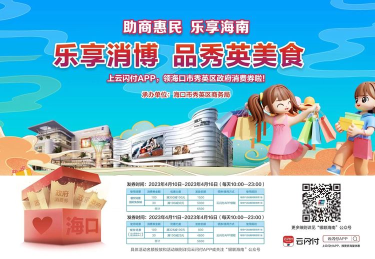 新海南客户端、南海网、南国都市报4月10日消息(记者 王康景)第三届中国国际消费品博览会期间,海口市秀英区将举办“乐享消博•品秀英美食”活动,并在4月10日至16日(每天10:00—23:00)发放政府消费券50万元,助力市民游客在秀英乐享盛会。