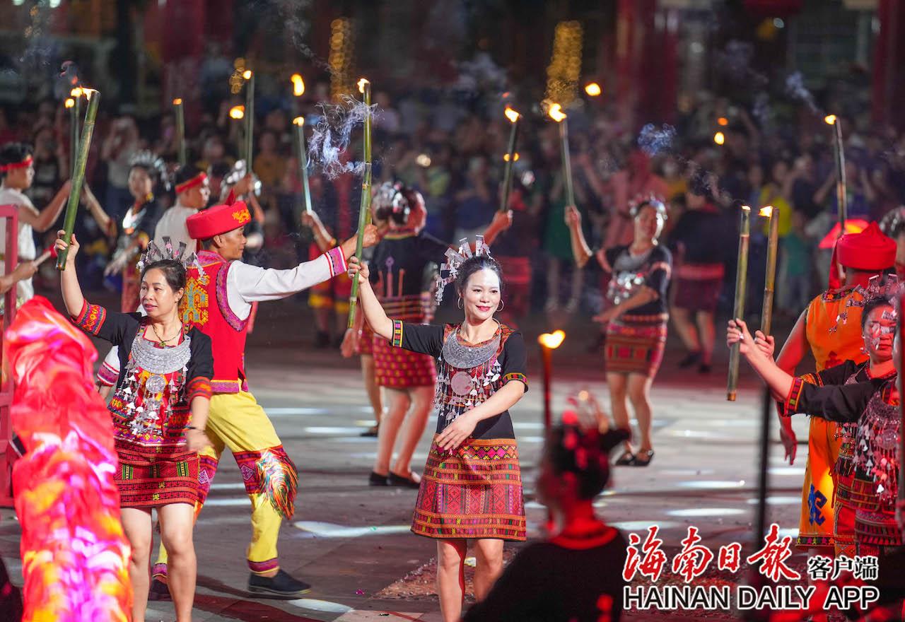 4月17日,在五指山市通什镇的三月三广场,黎族群众持火把跳起共同舞。海南日报记者 李天平 摄