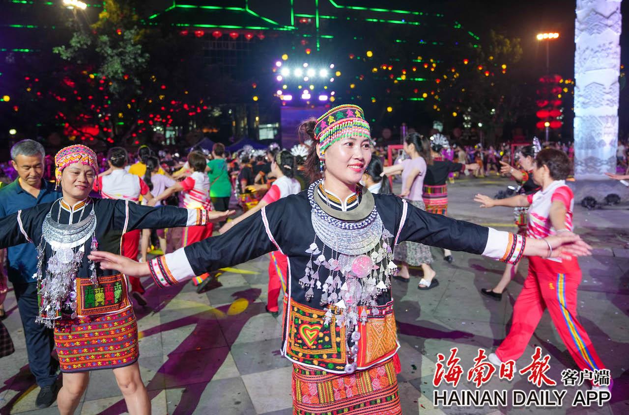 4月17日,在五指山市通什镇的三月三广场,市民齐跳共同舞,欢庆“三月三”。海南日报记者 李天平 摄