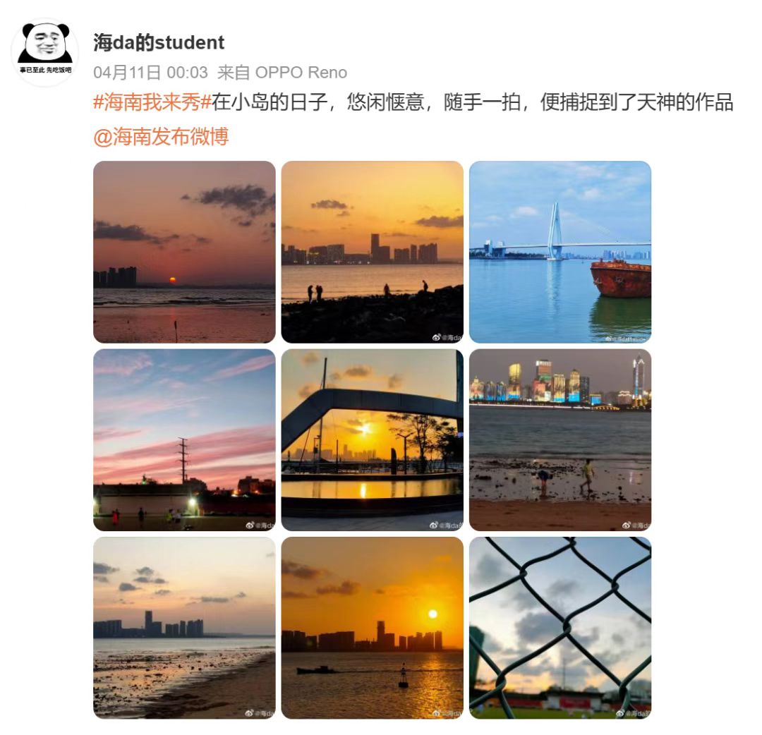 新海南客户端、南海网、南国都市报4月17日消息(记者 王燕珍)一张张美图颜值爆表,让人直呼“绝美”,堪称海南美景“名场面”集合,自4月10日海南发布联合海南省融媒体中心、各市县融媒、各厅局政务号、海南省新媒体协会、海口市新媒体协会共同推出“海南我来秀”活动第一期主题“秀海南名片”以来,吸引了海南社会各界、各地网友参与。不仅海南大部分市县融媒纷纷投稿,就连海南省新媒体协会、海口市新媒体协会,自媒体达人也踊跃参加,大家纷纷晒出各地的美景美食等,俨然成为所在地区的“代言人”。活动上线后,截至4月17日22时左右,就有1300多人次参与讨论,仅微博话题阅读量就有217万+。