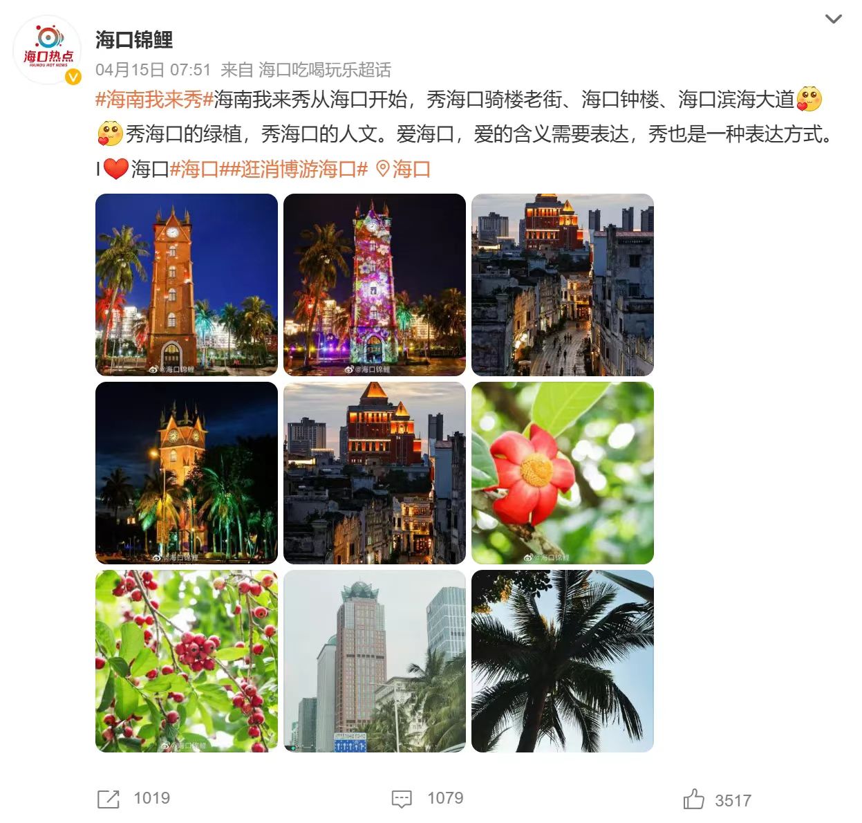 微博网友@海口锦鲤所晒的海口骑楼老街、海口钟楼、海口滨海大道美景美轮美奂,一经发布立即引来众多网友围观点赞,“秀海口的绿植,秀海口的人文。爱海口,爱的含义需要表达,秀也是一种表达方式”;网友@Choa999 所晒的“我眼中的观海台”,只见图片中,碧海蓝天映衬下的观海台充满异域风情,洁白的浪花如潮涌来,十分吸睛。