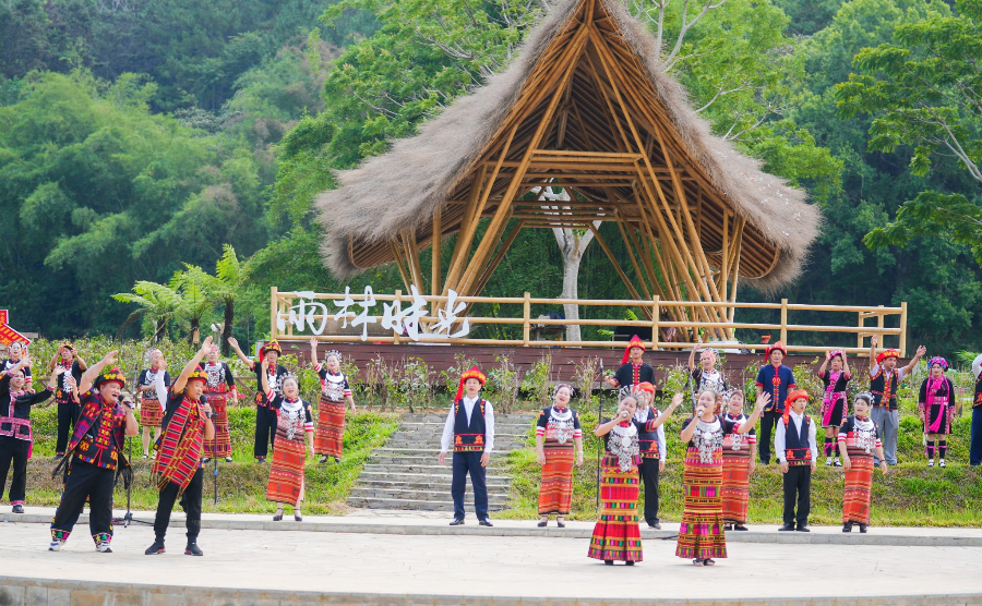 在雨林时光广场,这里正进行黎族民歌竹筏对唱。在青山绿水间,阿哥阿妹撑着竹筏对歌,让游客沉浸式体验黎族传统音乐魅力。
