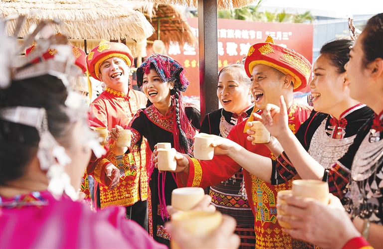 近日,在乐东等地,当地群众举杯欢庆“三月三”。 新华社记者 樊雨晴 摄