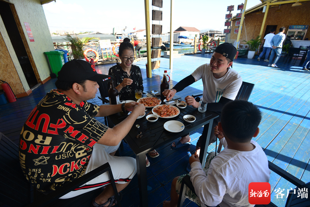 游客在海上民宿吃海鲜。记者 陈卫东 摄