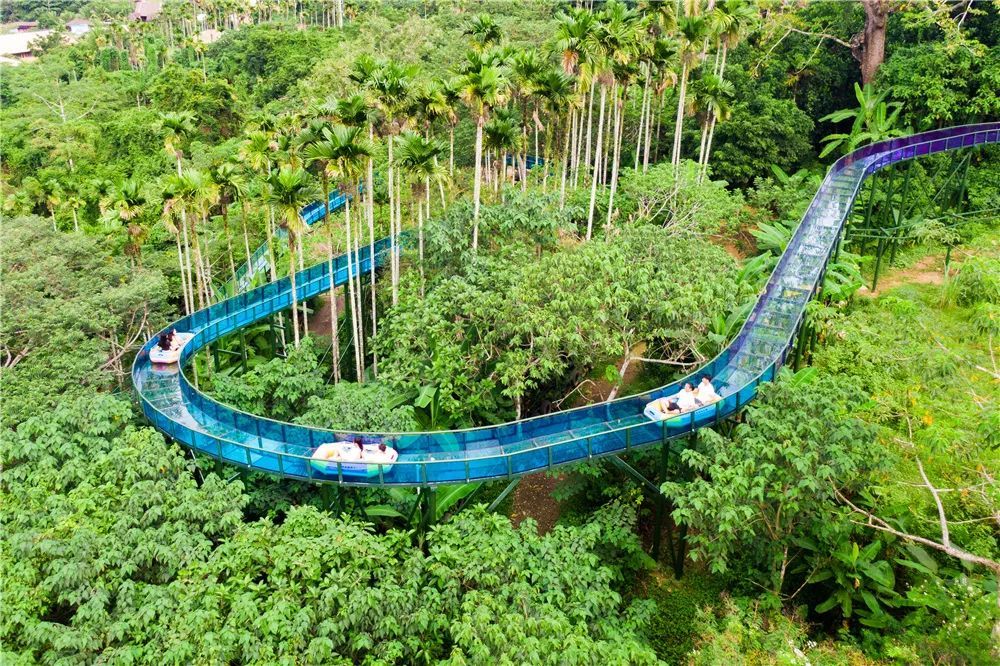 此外,景区内不仅建有空中小火车、水陆越野车、山地滑车等游玩项目。还有雨林水漂体验项目,全长800米的七彩玻璃水槽,双人座气垫船提供完美体验。