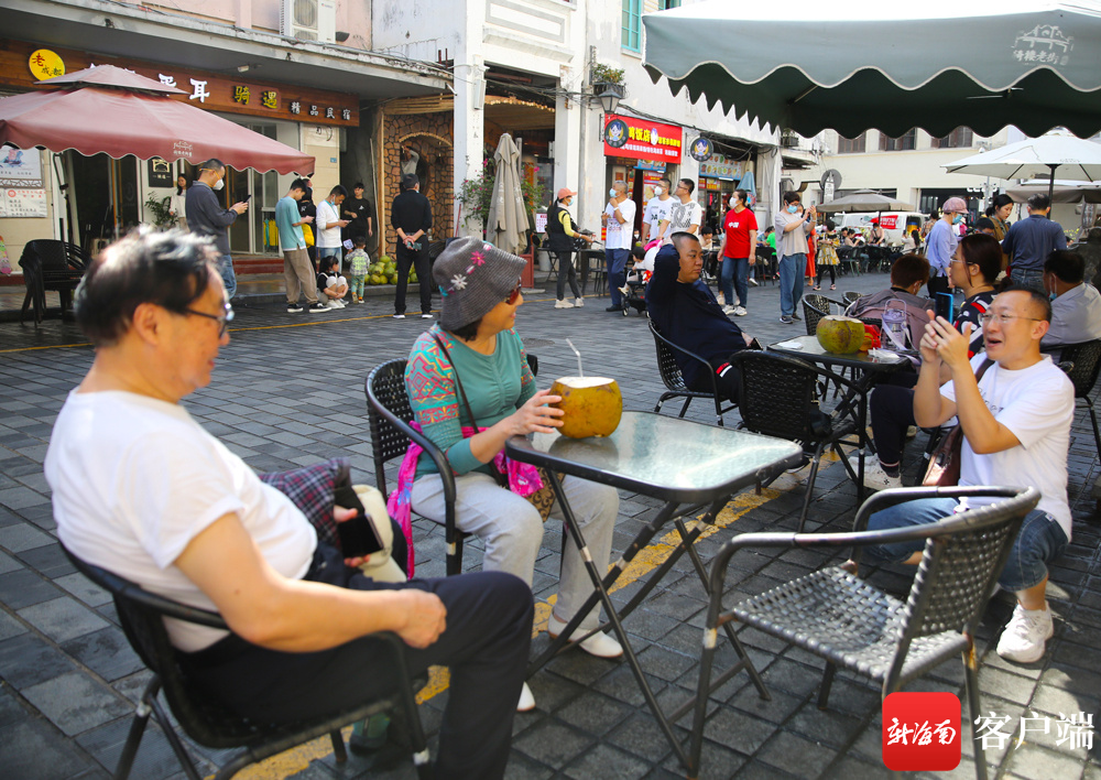 游客在海口骑楼老街品尝椰子。记者 汪承贤 摄