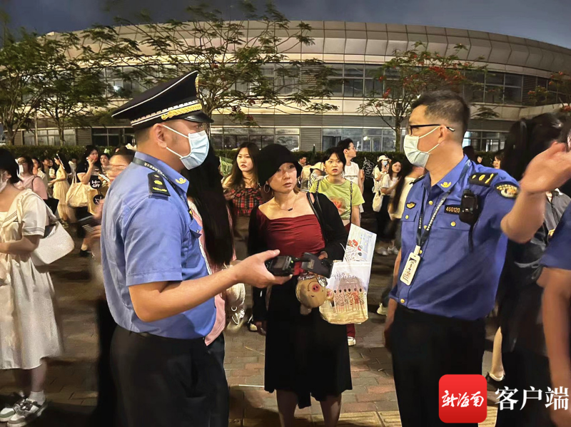 “您好,寄存行李往里面走,填写好卡片,我们志愿者会帮你们保管好,祝你们玩得开心。”“来,姑娘们,喝点水”。为了此次演唱会顺利进行,海口市各相关职能部门全力保障,化身“服务员”,为歌迷们保驾护航。
