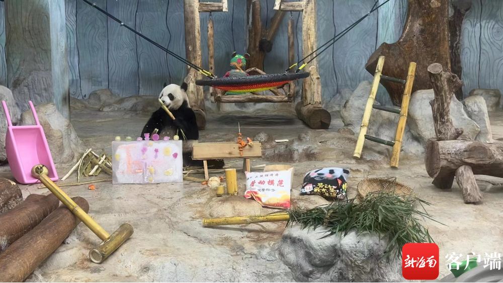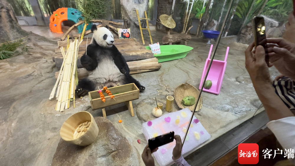 大熊猫贡贡在空调房里“撸串”。海南热带野生动植物园供图