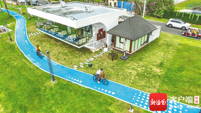 近日,在海南环岛旅游公路琼海博鳌段,市民游客在海滨小道和观景台上骑行、观光。