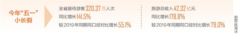在业内,“五一”档一直被看作全年旅游市场的“期中考”,是行业的重要节点,也是全年旅游行情的风向标。今年的这场“期中考”,海南取得了近十年来的最好成绩——全省接待游客320.37万人次,同比增长141.5%,较2019年同期同口径(下同)对比增长55.1%;旅游总收入42.32亿元,同比增长178.8%,较2019年增长79.0%。