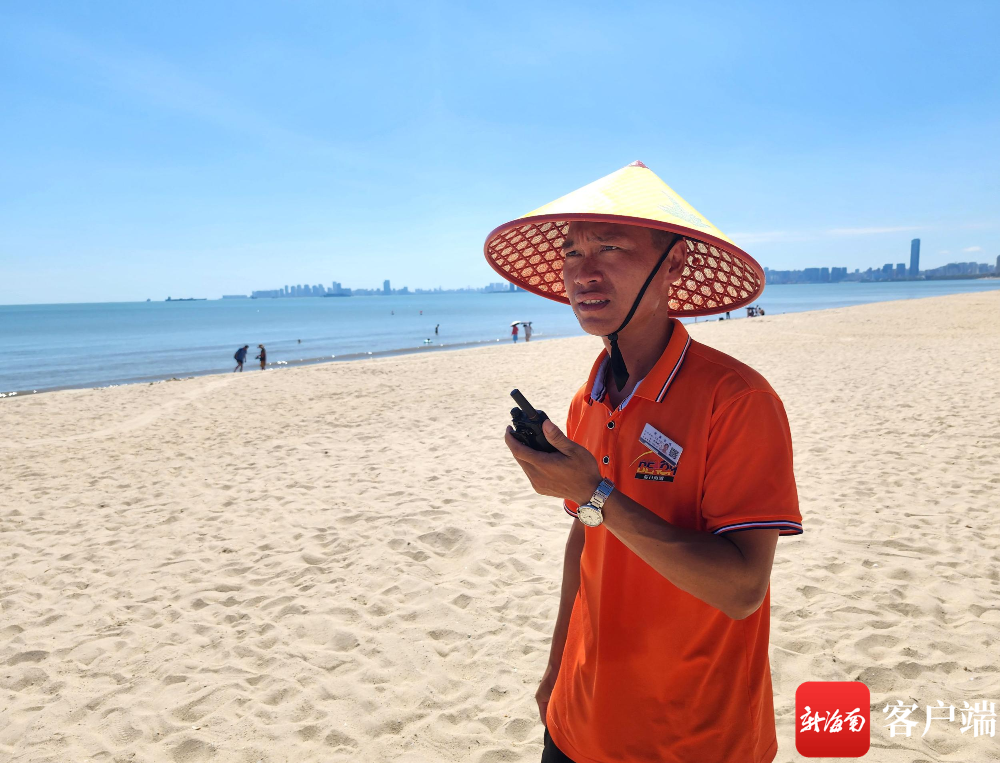 假日海滩工作人员拿着对讲机开始安全巡逻。记者 汪承贤 摄