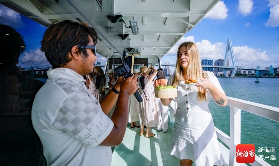 海南旅游国际推荐官打卡海旅游船。记者 李昊 摄