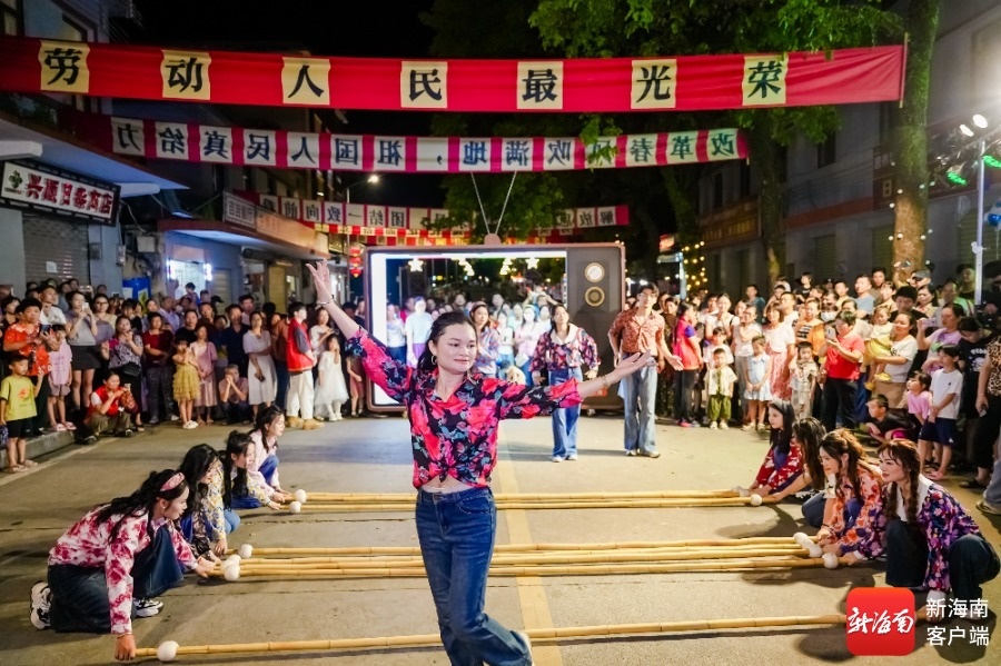 上一秒,二八大杠自行车的铃铛声穿越霓虹光影;下一秒,《冬天里的一把火》的旋律混着黎族竹木器乐韵律响起……观众仿佛被拉回到1988年的海南。