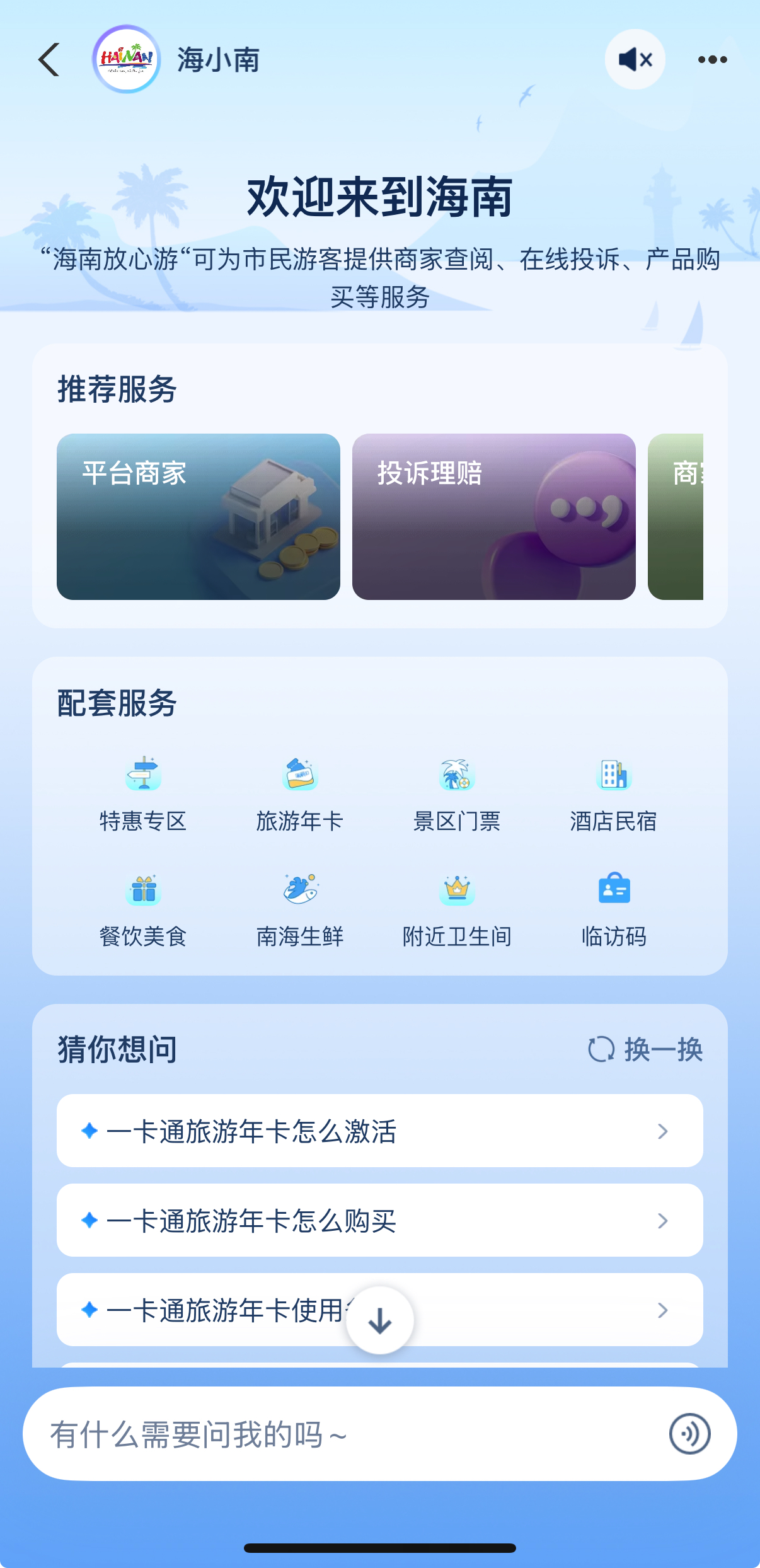 “海小南”作为游客在海南的专属旅游搭子,可提供当地商户信息查询、在线投诉理赔、旅游产品购买等综合服务功能。
