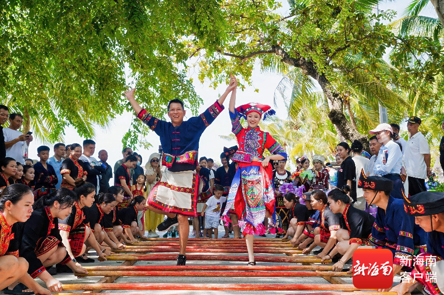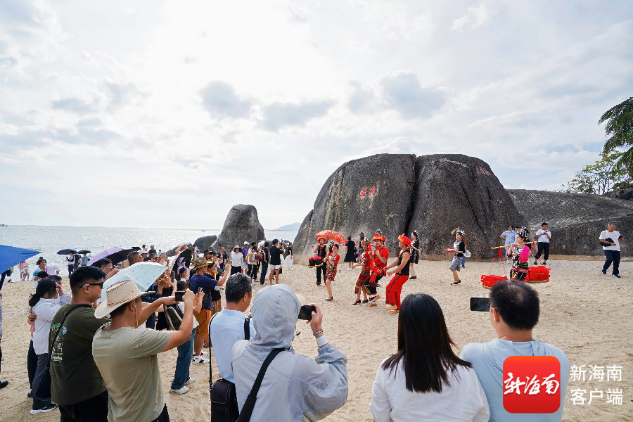 游客在天涯海角游览区观看黎族打柴舞演出。天涯海角游览区供图