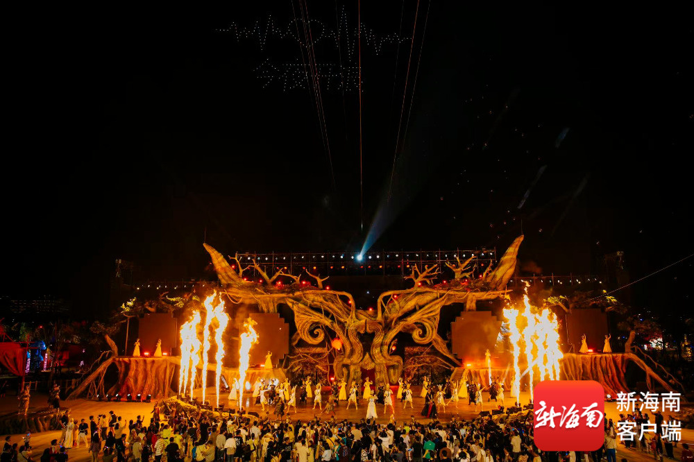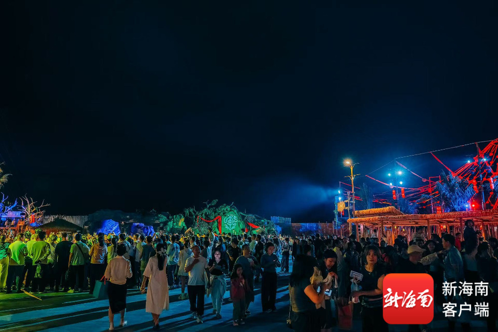 活动当晚,随着酋长部“三月三盛会”万象迎宾仪式启动,十大主题部落同步亮灯,夜游体验正式拉开帷幕。黎母部神藤下,红绳许愿墙迅速挂满游客心愿;神缘部《锦书为聘》黎族婚礼秀上,部分游客受邀参与仪式,深度感受非遗婚俗魅力;野人部的篝火狂欢成为“解压乐园”,欢声笑语不断;灵鹿部鹿神雕像点亮瞬间,全场欢呼雀跃,随后的海岛蹦迪大会与百架无人机表演,将现场氛围推向高潮。