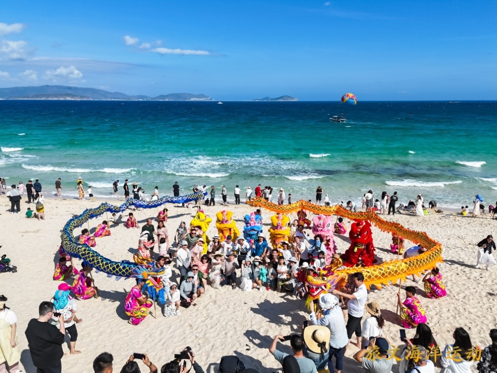 春节假期,游客在三亚亚龙湾观看舞龙舞狮表演。受访者供图